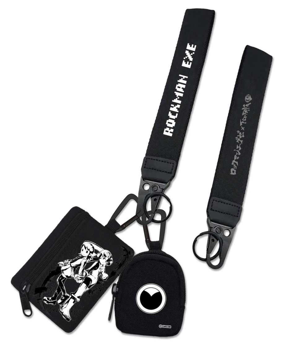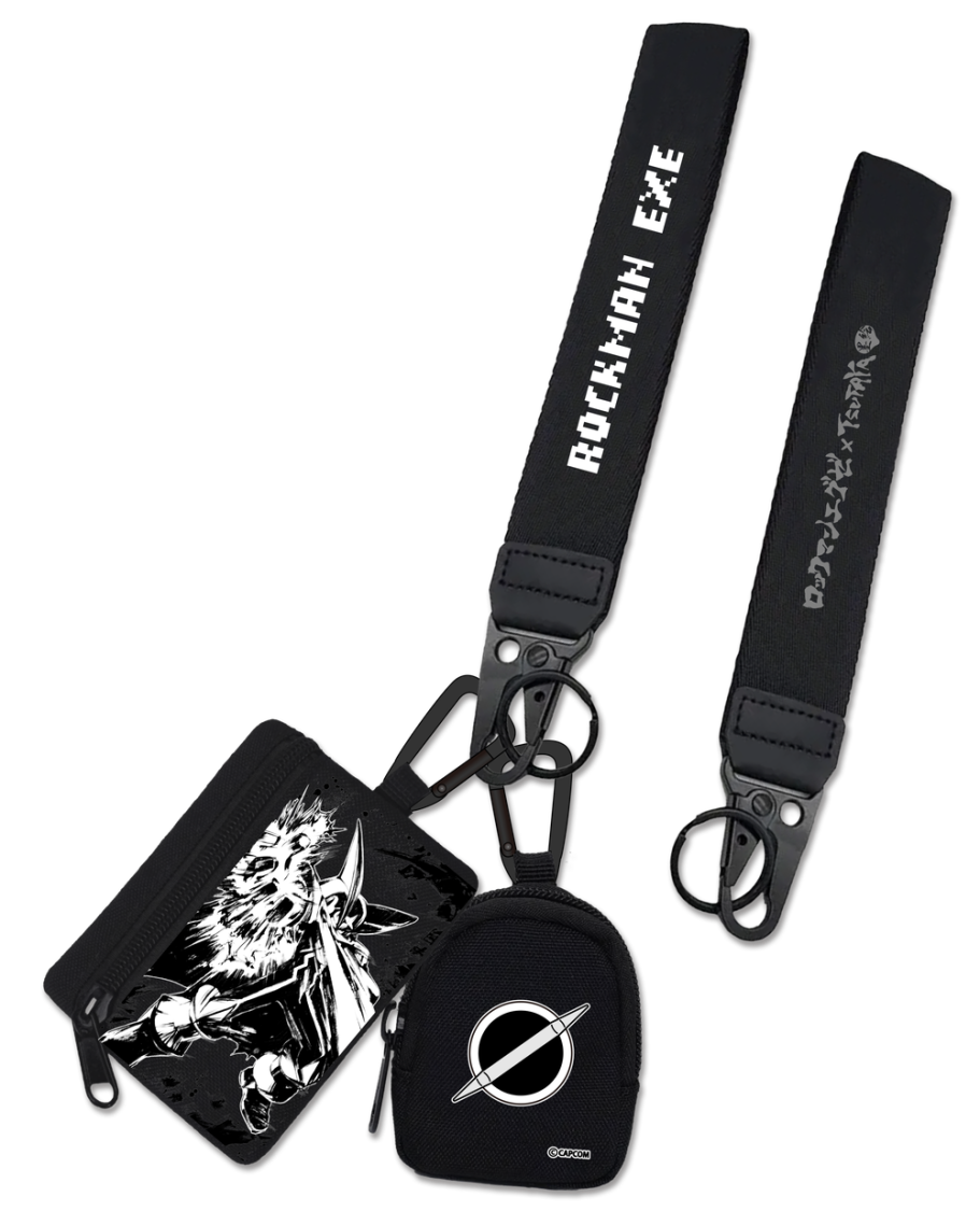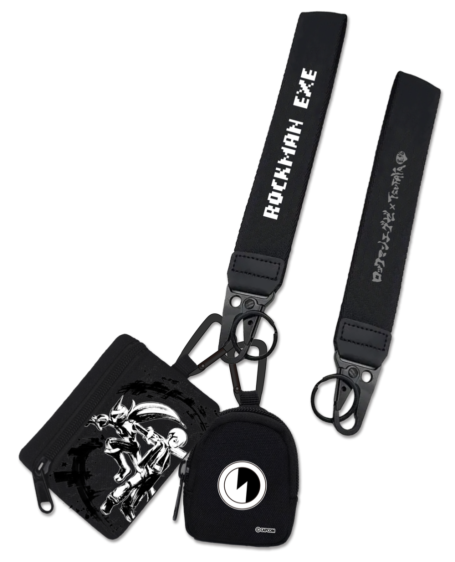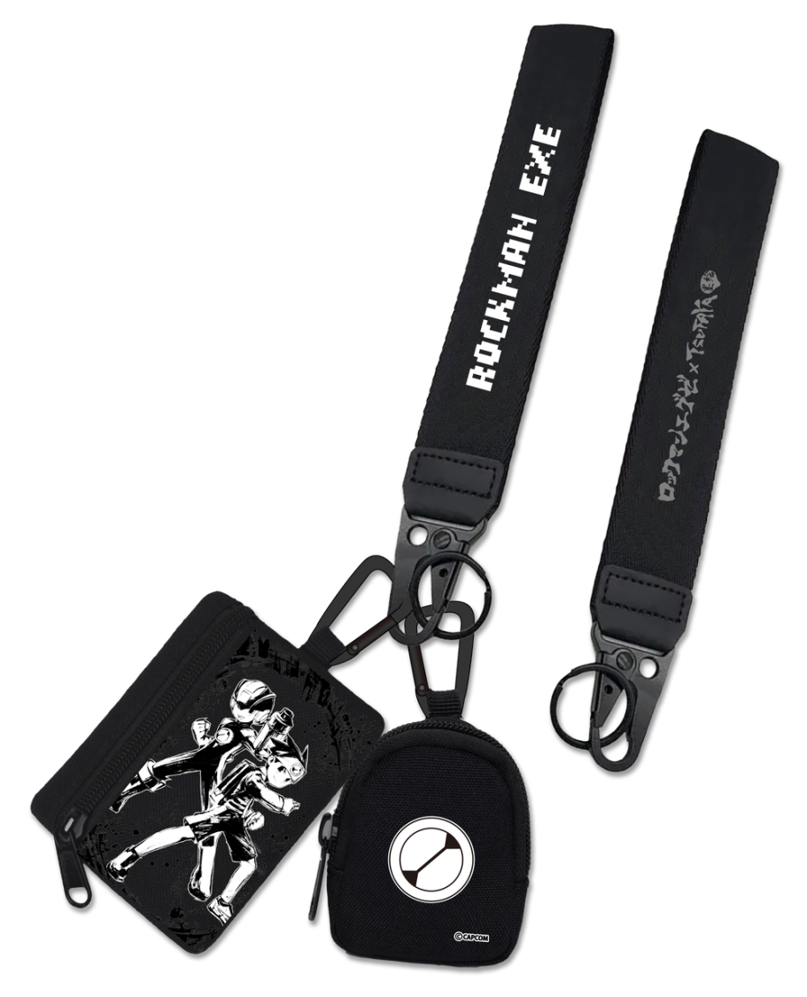 タイトルロゴ入りのハンドストラップ、墨絵で描かれたキャラクターをフロントに配したジッパーポーチ、ロゴがワンポイントになったミニポーチの3点をセットにしたスタイリッシュなデュアルポーチリストレット。