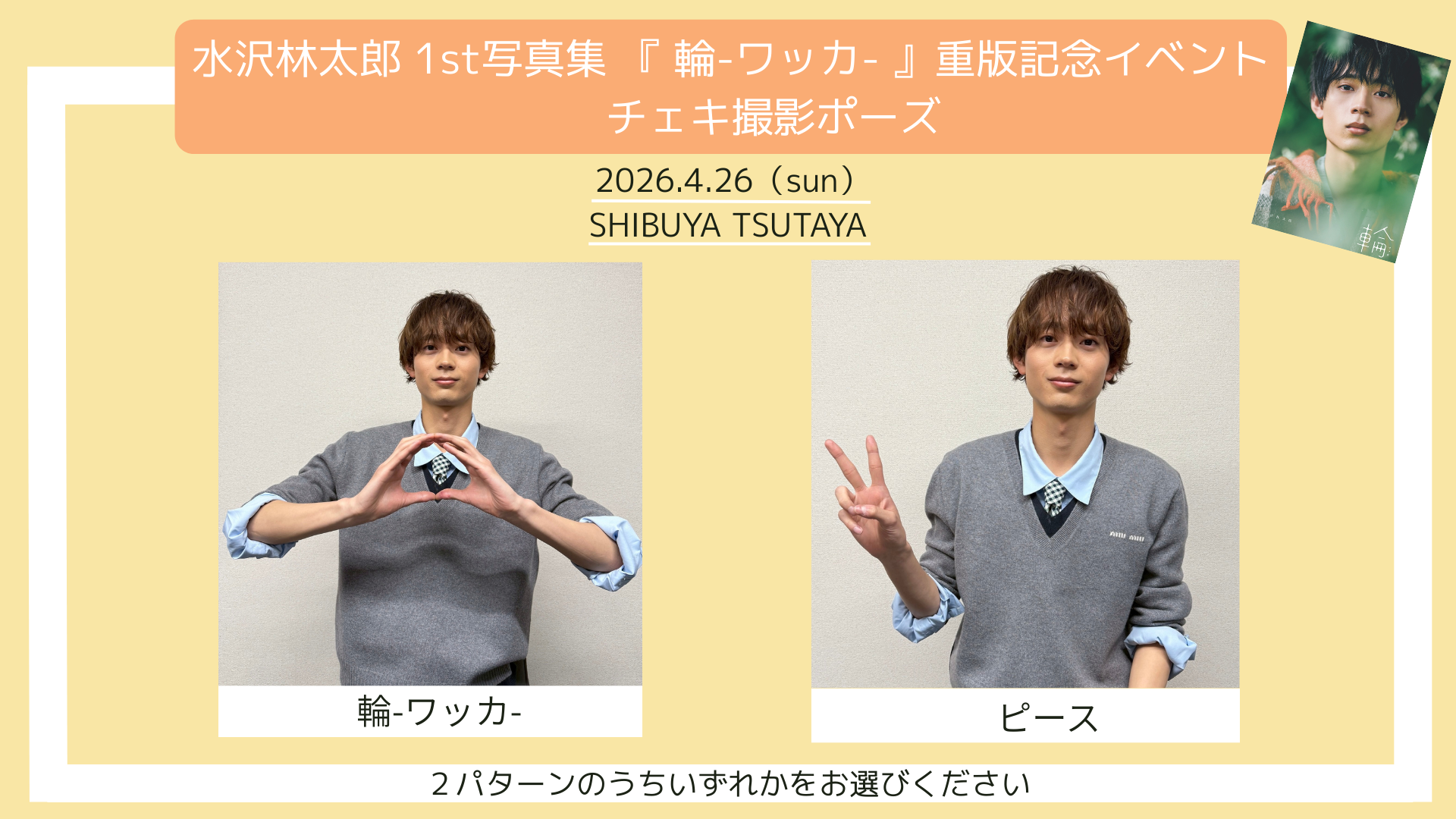 ※チェキ撮影ポーズはお客様自身で指定はできません。ポーズは「輪-ワッカ-」か「ピース」のうち、いずれか1ポーズをお選びいただけます。(ポーズの詳細は下の画像をご参照ください)